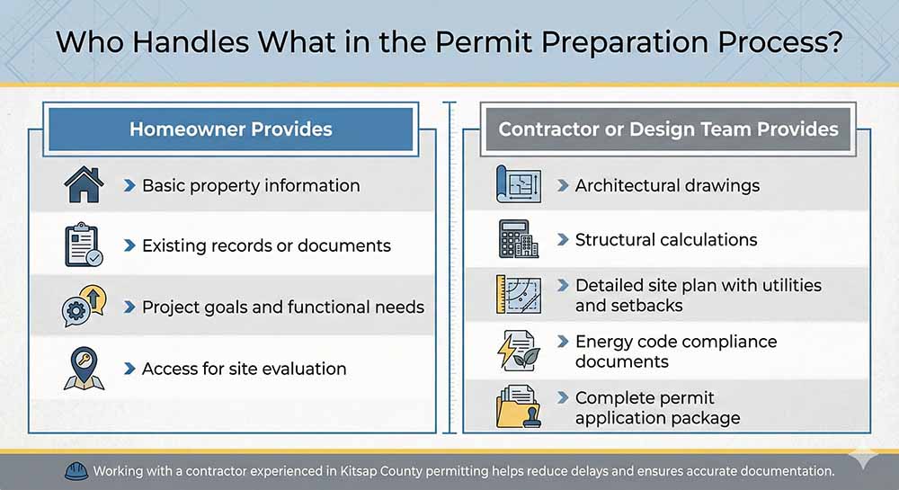 Homeowners should prepare the key documents that Kitsap County typically requires. These include architectural drawings, structural calculations when needed, and an accurate site plan showing utility lines and property boundaries. Clear documentation speeds up the permitting process and reduces the likelihood of corrections.